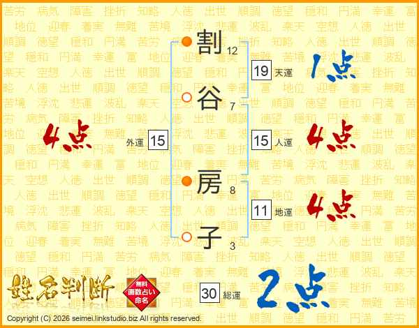 生活面を象徴する運勢です。外部から受ける影響力を表し、結婚運、家庭運や職場、環境への順応性を表します。総運から人運を引いた画数。姓や名が1文字の場合を除く。