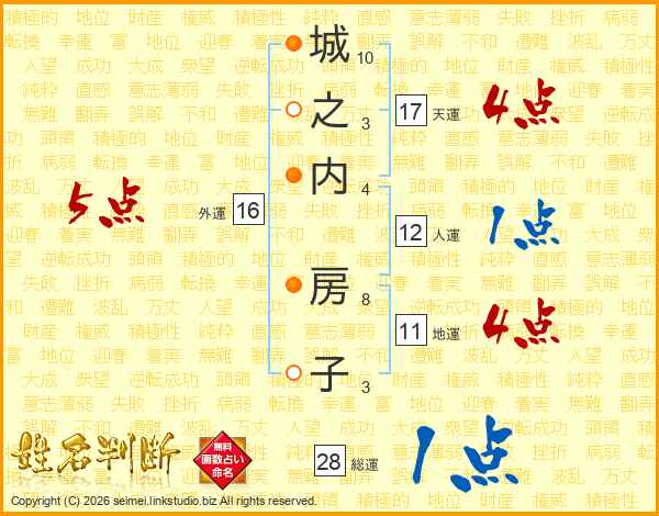 城(10画)之(3画)内(4画) 房(8画)子(3画)