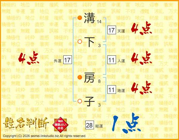 生活面を象徴する運勢です。外部から受ける影響力を表し、結婚運、家庭運や職場、環境への順応性を表します。総運から人運を引いた画数。姓や名が1文字の場合を除く。