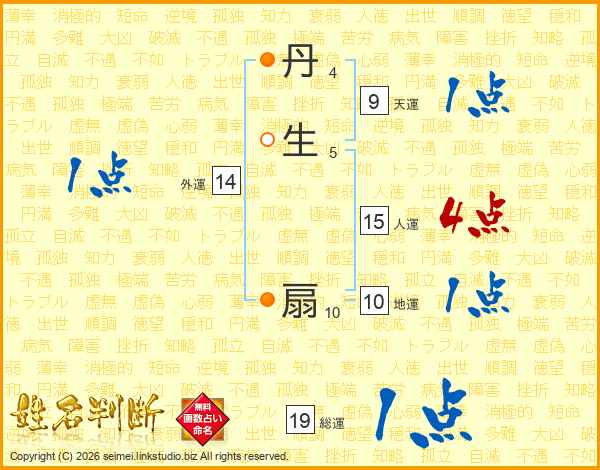 生活面を象徴する運勢です。外部から受ける影響力を表し、結婚運、家庭運や職場、環境への順応性を表します。総運から人運を引いた画数。姓や名が1文字の場合を除く。