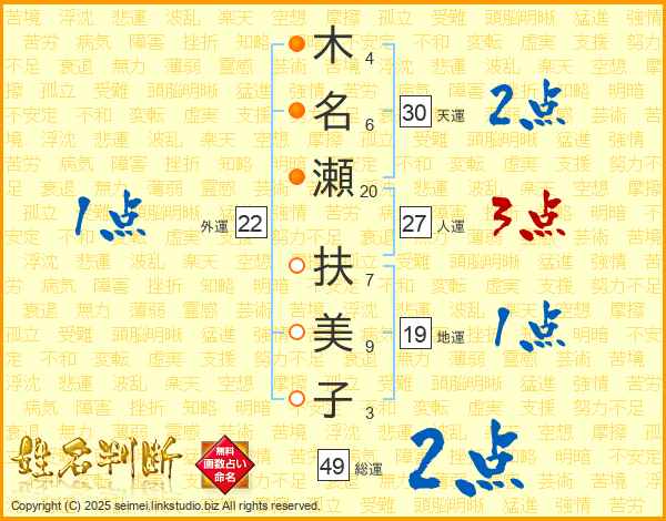 木(4画)名(6画)瀬(20画) 扶(7画)美(9画)子(3画)
