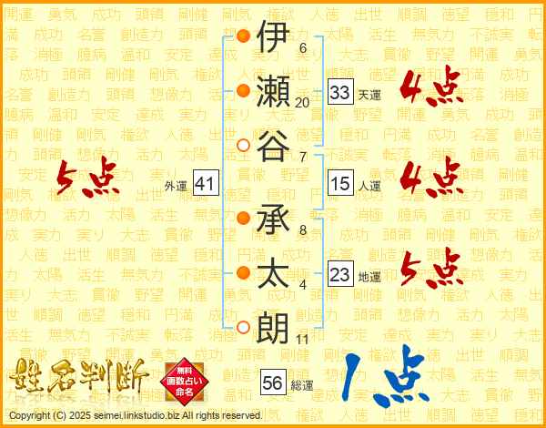 伊(6画)瀬(20画)谷(7画) 承(8画)太(4画)朗(11画)