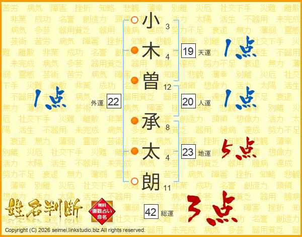 小(3画)木(4画)曽(12画) 承(8画)太(4画)朗(11画)