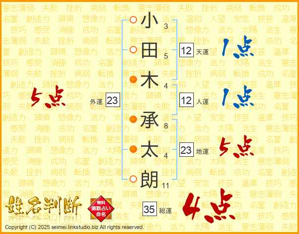 小(3画)田(5画)木(4画) 承(8画)太(4画)朗(11画)