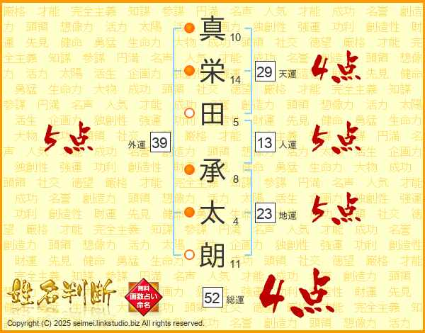 真(10画)栄(14画)田(5画) 承(8画)太(4画)朗(11画)