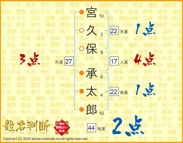 宮(10画)久(3画)保(9画) 承(8画)太(4画)郎(10画)