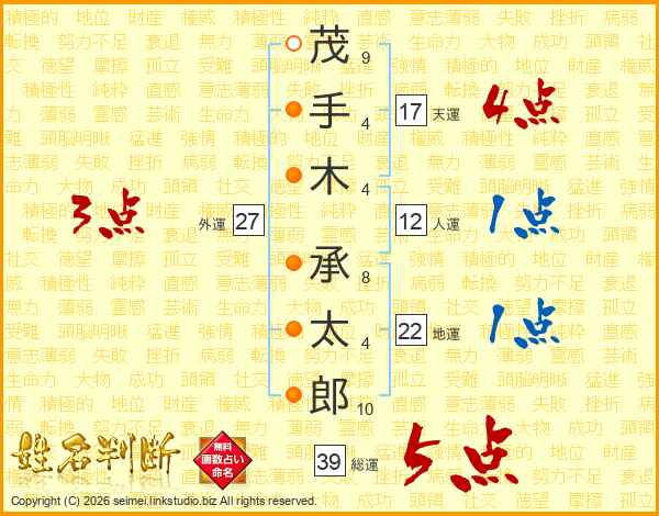 茂(9画)手(4画)木(4画) 承(8画)太(4画)郎(10画)