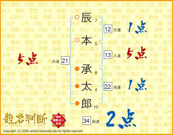 辰(7画)本(5画) 承(8画)太(4画)郎(10画)