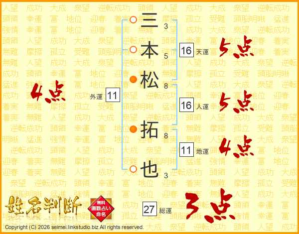 三本松拓也さんの総運は27画の3点!