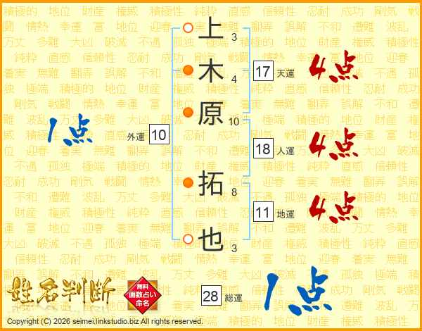 上木原拓也さんの人運は18画の4点!