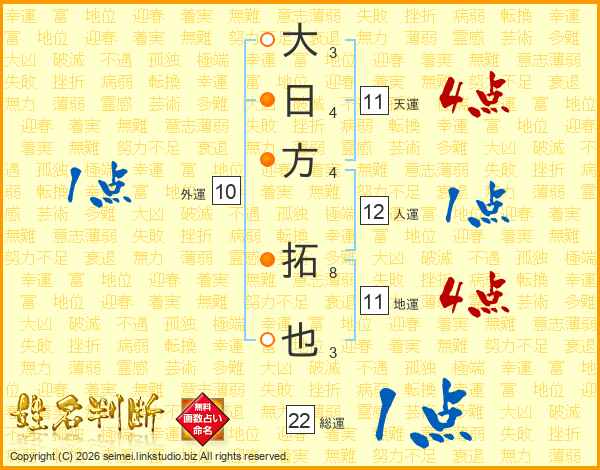 大(3画)日(4画)方(4画) 拓(8画)也(3画)