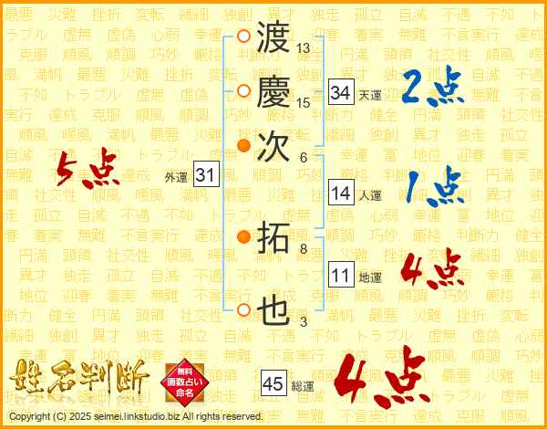 渡(13画)慶(15画)次(6画) 拓(8画)也(3画)