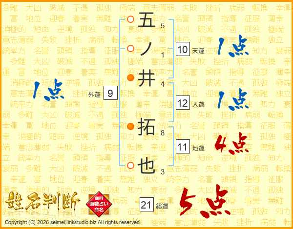 五ノ井拓也さんの総運は21画の5点!