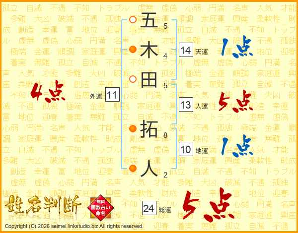 五(5画)木(4画)田(5画) 拓(8画)人(2画)