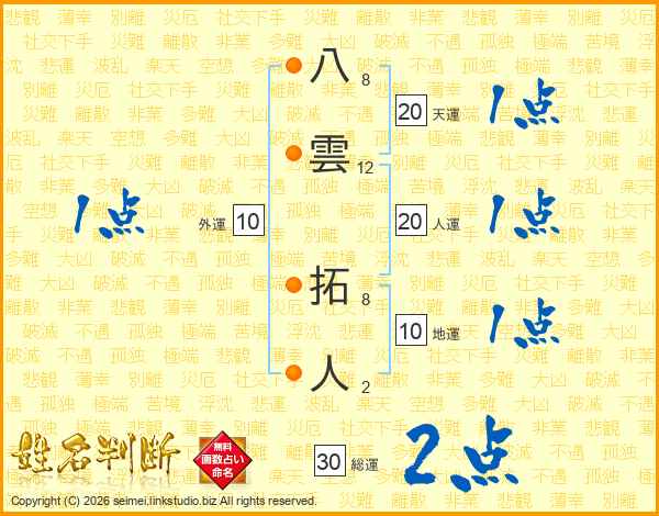 八雲拓人さんの天運は20画の1点!