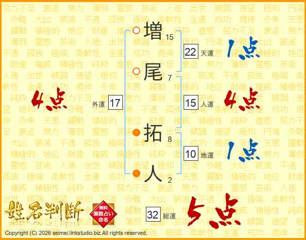 増(15画)尾(7画) 拓(8画)人(2画)