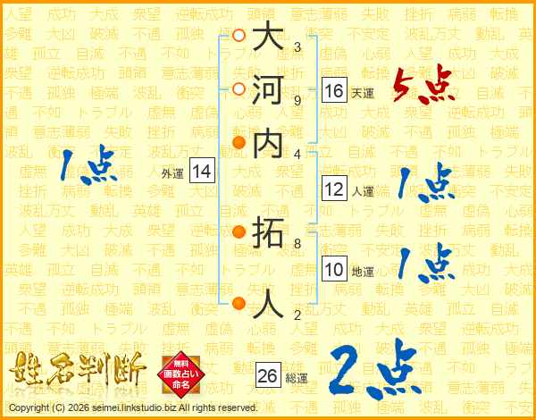 大河内拓人さんの総運は26画の2点!