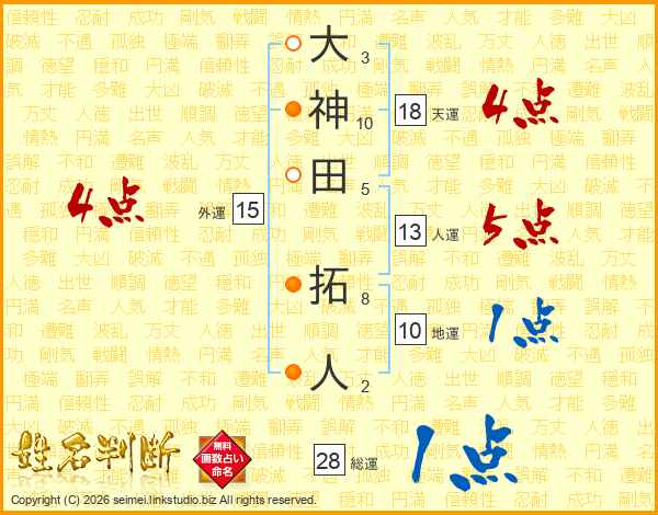 大神田拓人さんの総運は28画の1点!