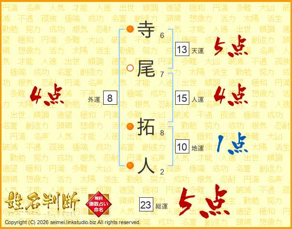 寺尾拓人さんの総運は23画の5点!