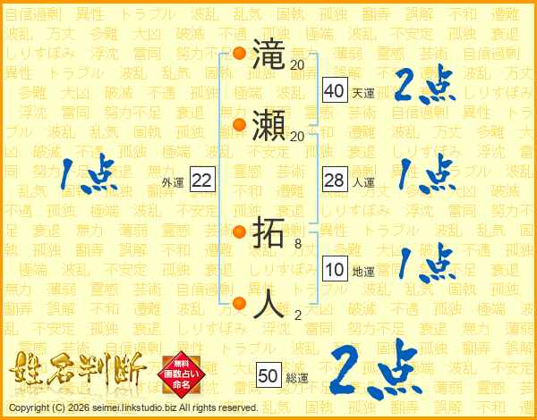 滝瀬拓人さんの総運は50画の2点!