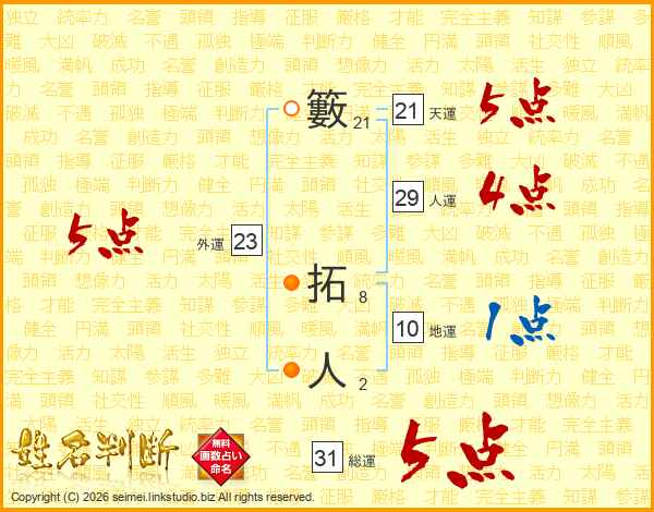 生活面を象徴する運勢です。外部から受ける影響力を表し、結婚運、家庭運や職場、環境への順応性を表します。総運から人運を引いた画数。姓や名が1文字の場合を除く。