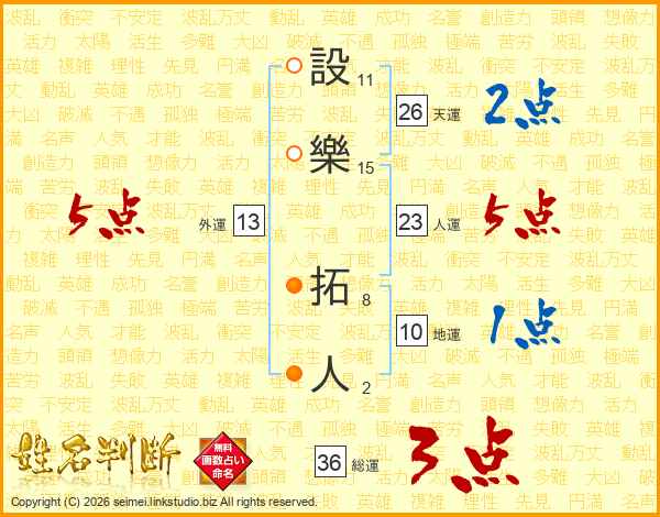 設樂拓人さんの天運は26画の2点!