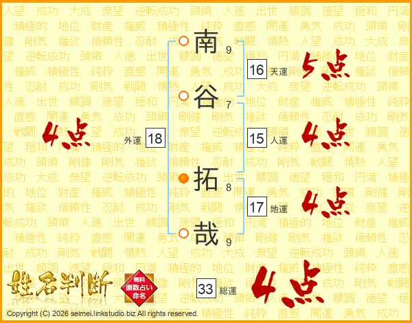 南(9画)谷(7画) 拓(8画)哉(9画)