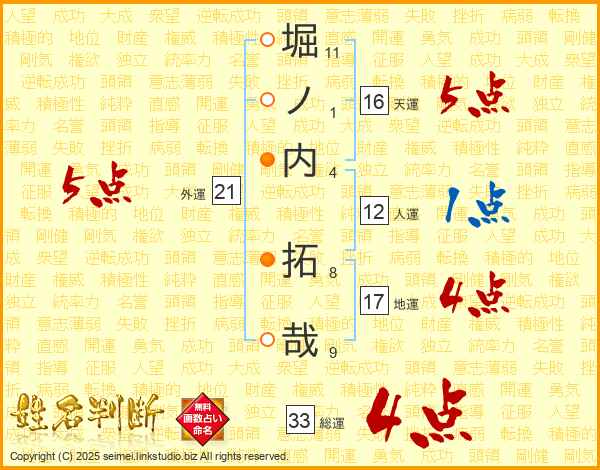 堀(11画)ノ(1画)内(4画) 拓(8画)哉(9画)