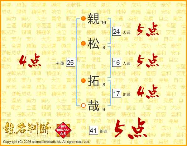 親(16画)松(8画) 拓(8画)哉(9画)