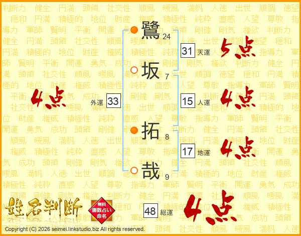 鷺(24画)坂(7画) 拓(8画)哉(9画)