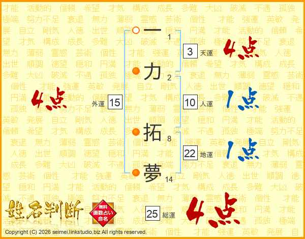 生活面を象徴する運勢です。外部から受ける影響力を表し、結婚運、家庭運や職場、環境への順応性を表します。総運から人運を引いた画数。姓や名が1文字の場合を除く。