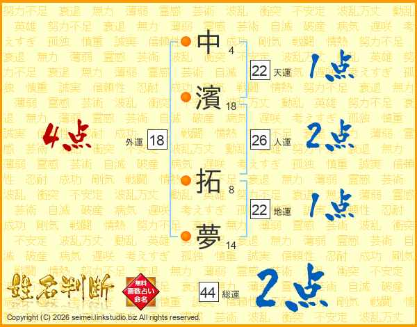 中濱拓夢さんの総運は44画の2点!