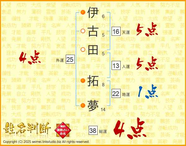 伊古田拓夢さんの総運は38画の4点!