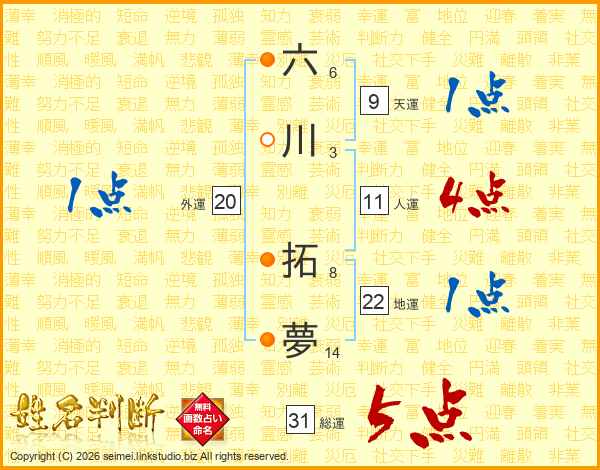 生活面を象徴する運勢です。外部から受ける影響力を表し、結婚運、家庭運や職場、環境への順応性を表します。総運から人運を引いた画数。姓や名が1文字の場合を除く。