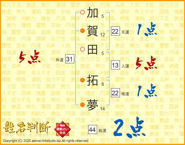 加(5画)賀(12画)田(5画) 拓(8画)夢(14画)