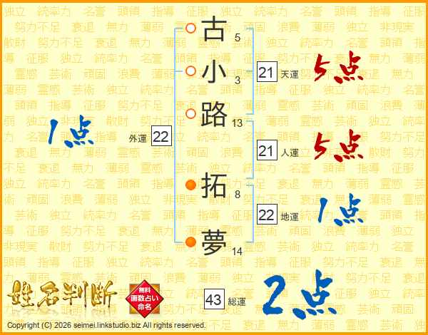 古小路拓夢さんの人運は21画の5点!