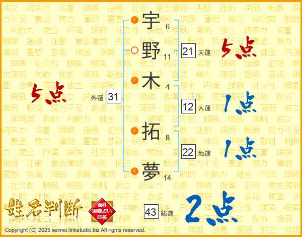 宇(6画)野(11画)木(4画) 拓(8画)夢(14画)