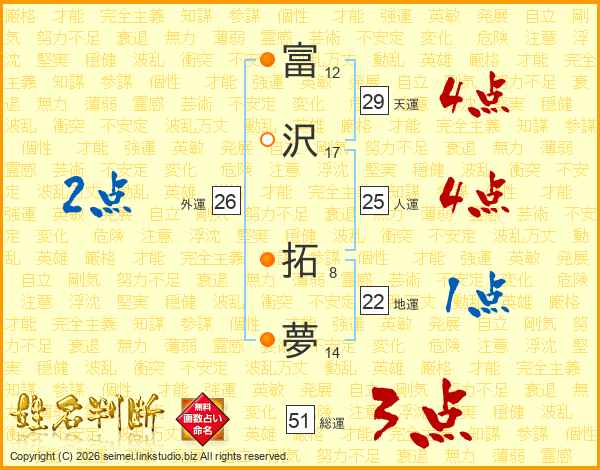富沢拓夢さんの人運は25画の4点!