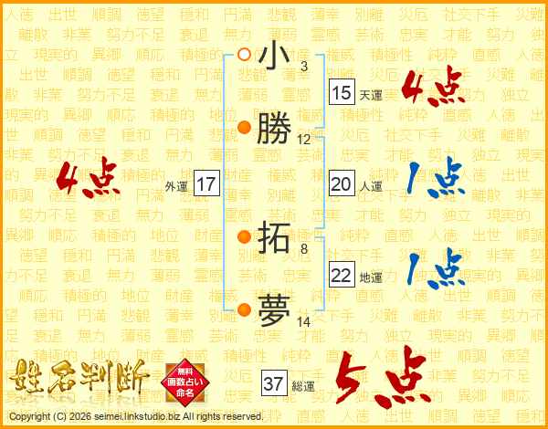 小勝拓夢さんの総運は37画の5点!