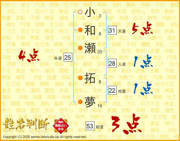 小(3画)和(8画)瀬(20画) 拓(8画)夢(14画)