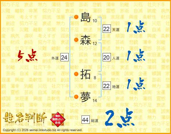 島(10画)森(12画) 拓(8画)夢(14画)