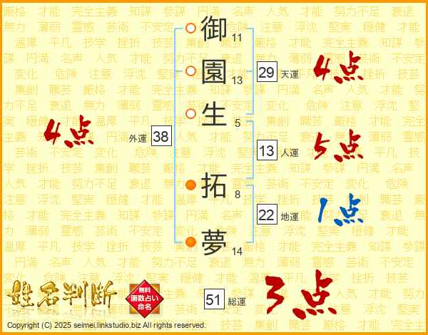 御(11画)園(13画)生(5画) 拓(8画)夢(14画)