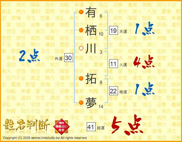 有(6画)栖(10画)川(3画) 拓(8画)夢(14画)