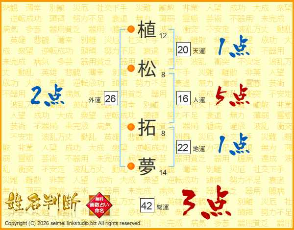 あなたの人生を表す1番重要な運勢です。生涯を通じて影響する総合運となり、主に50歳以降の晩年期に影響を及ぼします。苗字と名前の合計画数。