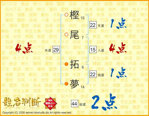 樫(15画)尾(7画) 拓(8画)夢(14画)