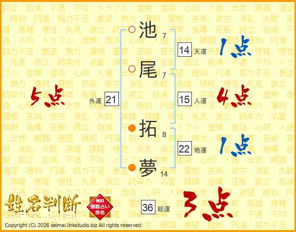 池(7画)尾(7画) 拓(8画)夢(14画)