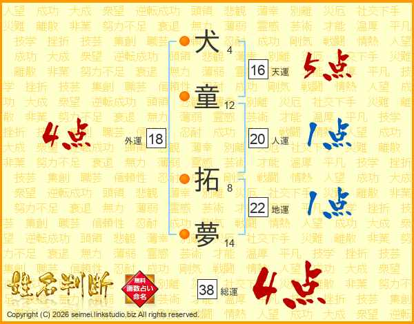 犬(4画)童(12画) 拓(8画)夢(14画)