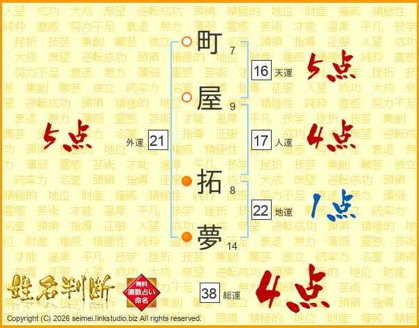 町屋拓夢さんの総運は38画の4点!