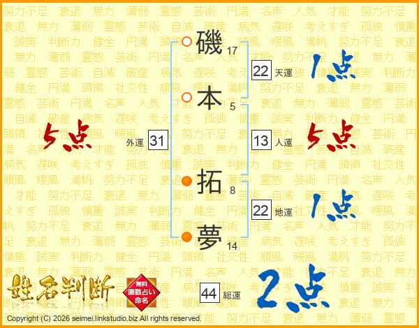 磯(17画)本(5画) 拓(8画)夢(14画)