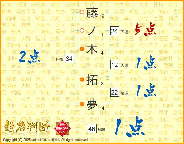 藤ノ木拓夢さんの総運は46画の1点!